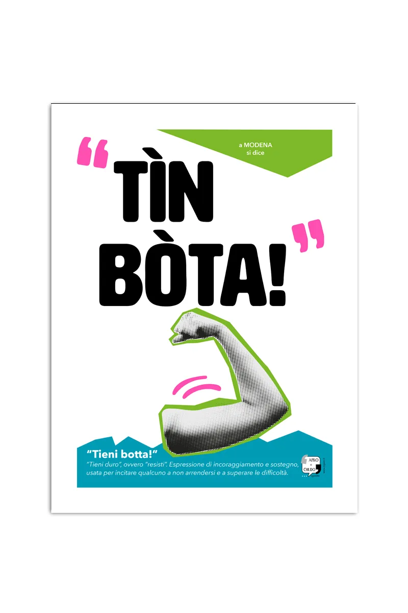 Energia e orgoglio modenese in un’unica opera! Il poster “TÌN BÒTA” celebra una delle espressioni più iconiche del dialetto emiliano, trasformandola in arte pop contemporanea.